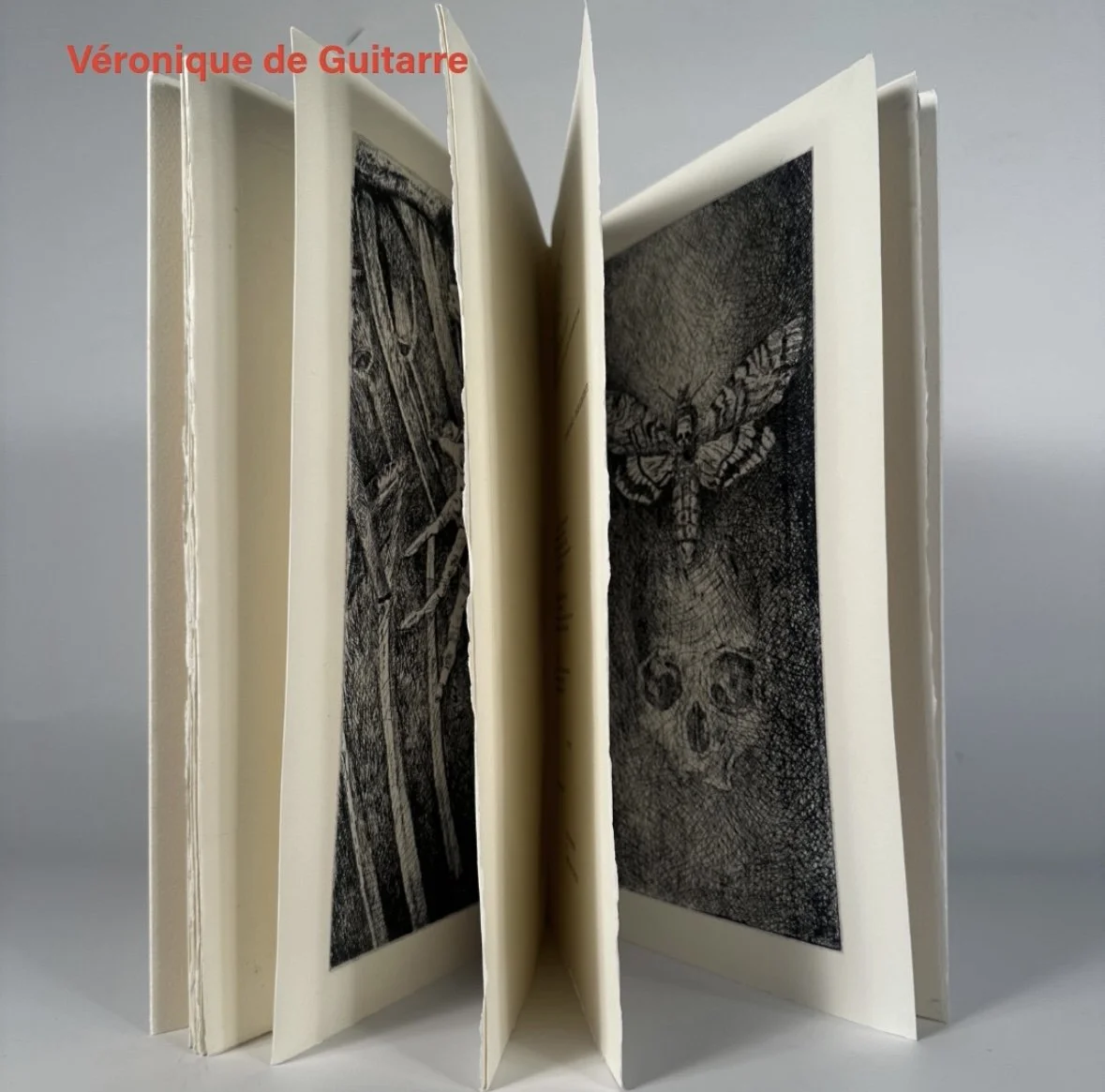 Artiste et graveure française, Véronique de Guitarre développe une œuvre marquée par l’intensité du noir et le contraste des textures. Ses livres d’artiste traduisent un univers introspectif où la matière devient mémoire et métaphore. À travers ses eaux-fortes, elle aborde les thèmes du passage, du silence et de la transformation, dans une esthétique à la fois sobre et profondément évocatrice.